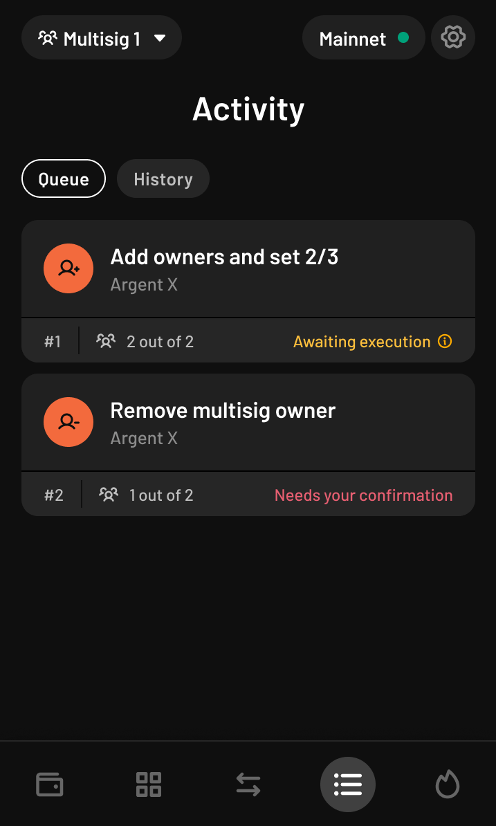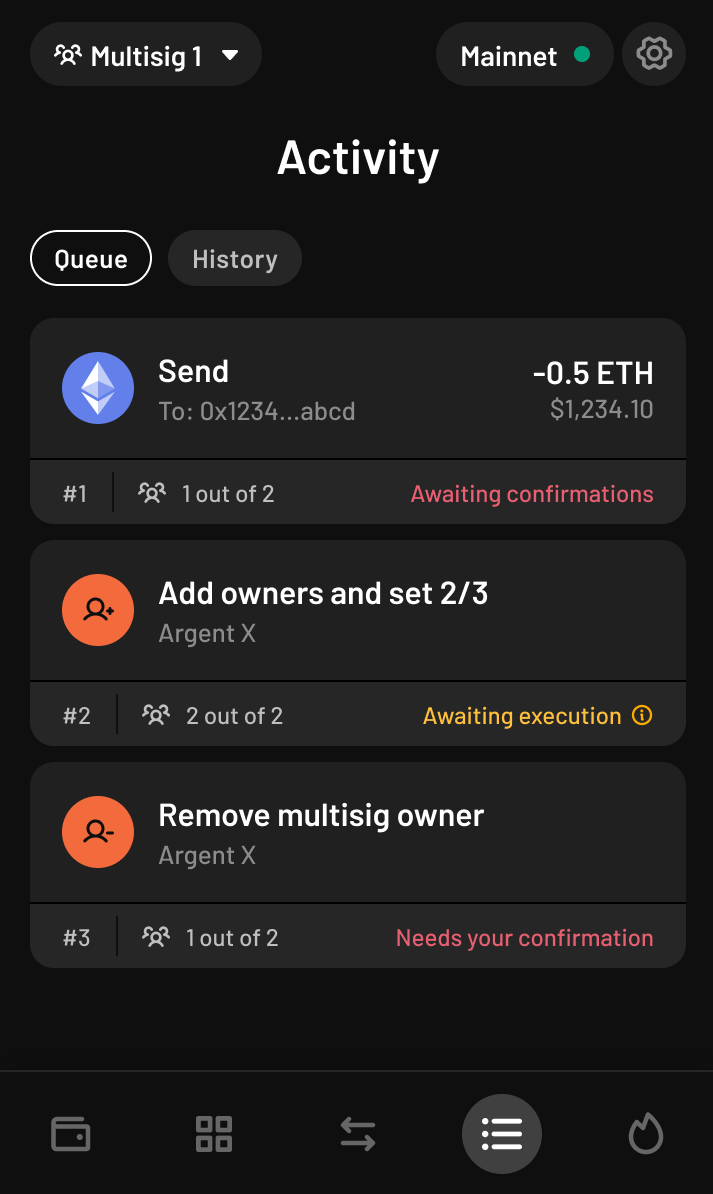 Ready Wallet Multisig accounts allow users to queue and manage pending transactions.